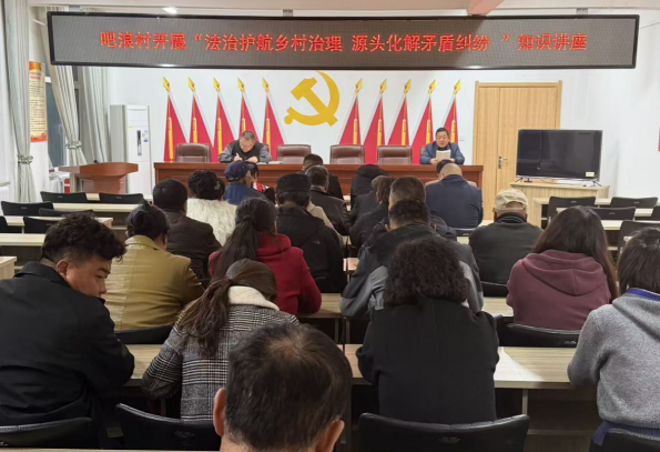 专题讲座强意识,法治宣传入人心。讲座现场,工作人员围绕乡村常见的邻里纠纷、土地流转、婚姻家庭、涉农政策等法律问题,结合真实案例,用通俗易懂的语言向村民讲解了《民法典》《人民调解法》等相关法律法规,重点解读了矛盾纠纷的预防、调解流程与维权途径,引导村民树立“办事依法、遇事找法、解决问题用法、化解矛盾靠法”的法治理念。村民们认真聆听、积极交流,现场学习氛围浓厚,进一步提升了村民的法律素养和依法维权意识,为源头化解矛盾筑牢了思想基础。