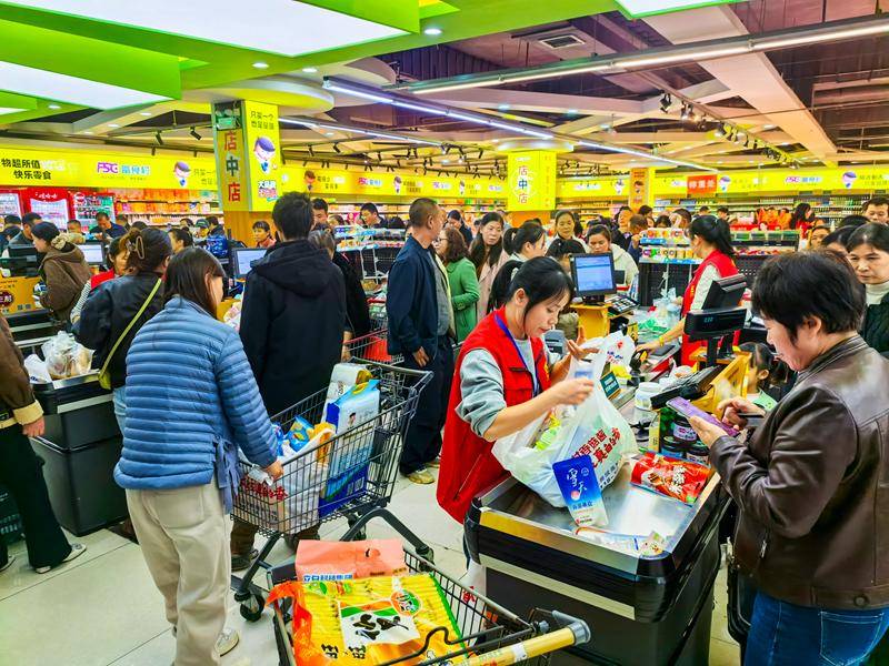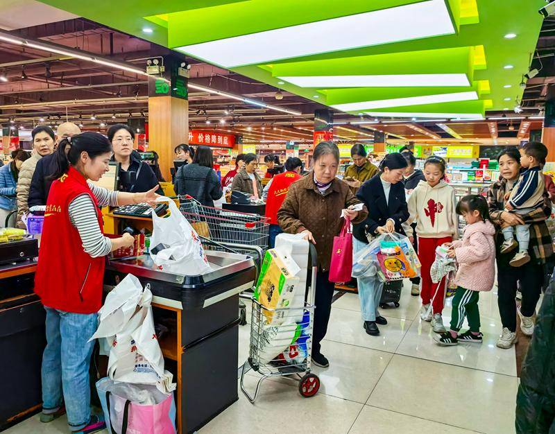 岳阳广电全媒体讯(记者:宁平)11月11日,是一年一度电商购物狂欢节。记者走进湖南临湘市规模较大的超市——新富食村购物广场,人山人海。该商超推出的8折优惠活动,吸引了成百上千市民驻足挑选,开启“买买买”模式。收银台前更是排起了购物长龙,呈现出一派火爆场景。