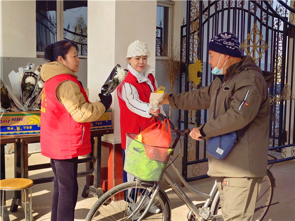 侯马市殡仪馆准备了很多鲜花,志愿者为祭祀家属免费送鲜花
