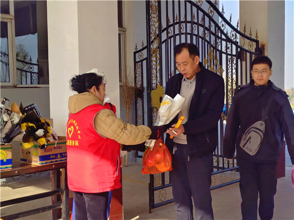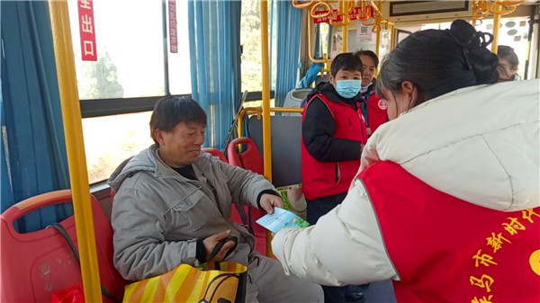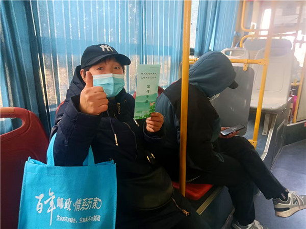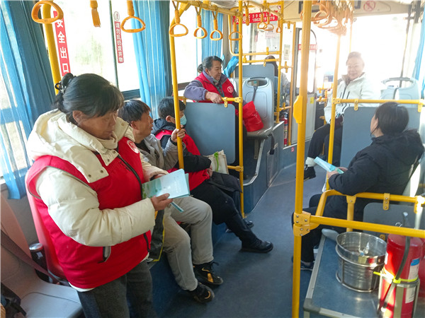 跟车执勤志愿者给顾客发放文明祭祀宣传册