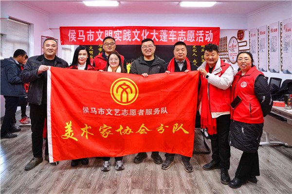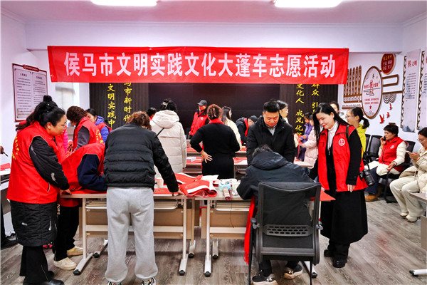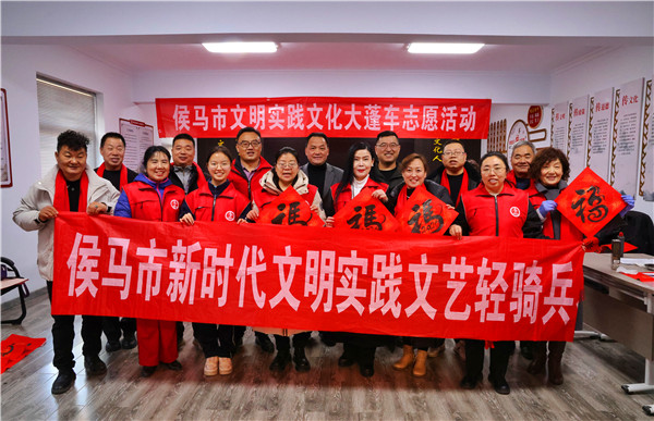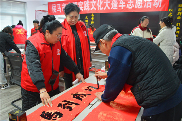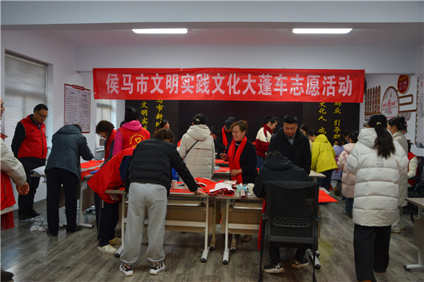 (本网山西讯:于妮妮 秦明忠)马年将至,翰墨传情。2月7日上午9点,星期六,农历腊月二十,侯马市新时代文明实践中心“文化大篷车”和“文艺轻骑兵”两个实践项目团队,联合浍滨街道办事处文明实践所,开展了一场“笔墨迎春·祝福到家”迎新春送春联志愿服务活动。
