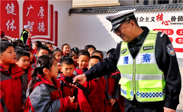 交管大队宣传科科长郭峰为大家讲解交通知识,并向回答问题的学生给予奖励