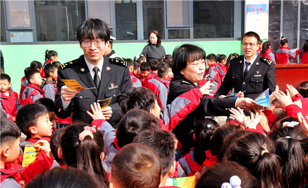 临汾海关工作人员为学生们发放进口食品安全治理、维护国门生物安全等主题宣传资料