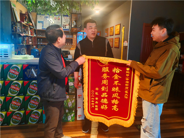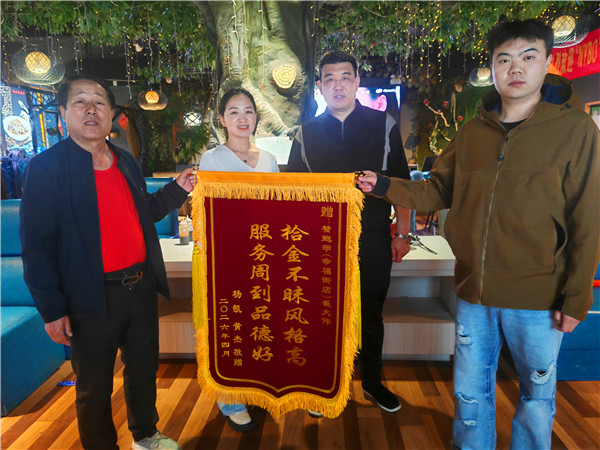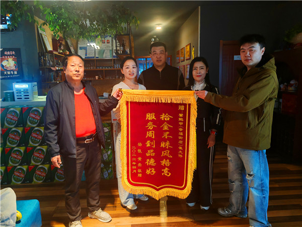 (本网山西讯:于妮妮 秦明忠)4月12日下午,在新田广场东侧幸福街蟹鲍甲饭店,一位名叫杨凯的市民和朋友一起,为这家饭店老板崔大伟送来了一面锦旗:“拾金不昧风格高,服务周到品格好”