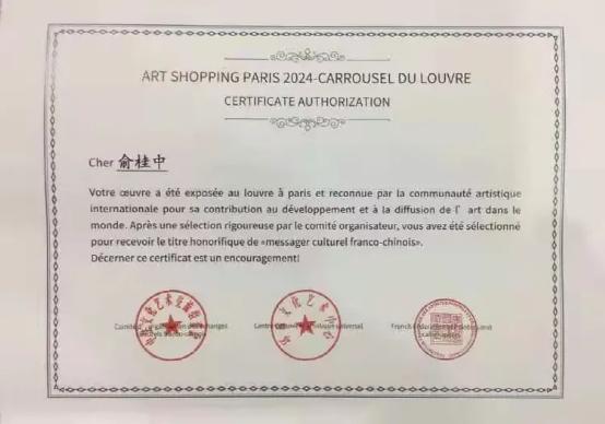 俞桂中老师2018年应邀参加中 央电视台书画筆会。先后荣获韩国、荷兰、意大利、美国四次美术作品展览金奖或特别金奖。作品《公鸡图》,《孔雀图》入选2024年法国卢浮宫国际艺术交流展。
