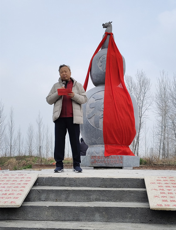 苏玲站长发言后,在阵阵掌声中,迎来了王献伟更加接地气儿的祝福和期盼。王献伟是仙翁庙村人,从小就热爱家乡的一草一木,走上工作岗位后,兢兢业业,如今退休了,作为省级非遗《仙翁庙与悬壶济世》传说的传承人,把大量的精力投入到本地民俗文化研究中,“福禄玉葫芦”安放仪式上,他的发言既朴实无华,又魅力十足。