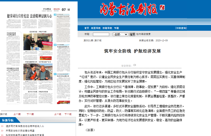 本网讯:包头讯近年来,中国工商银行包头分行始终坚守安全发展理念,强化安全生产“红线”意识,以健全全民安全生产责任制为核心抓手,层层压实责任、完善保障制度、强化风险管控,为地区经济发展筑牢了安全屏障。
