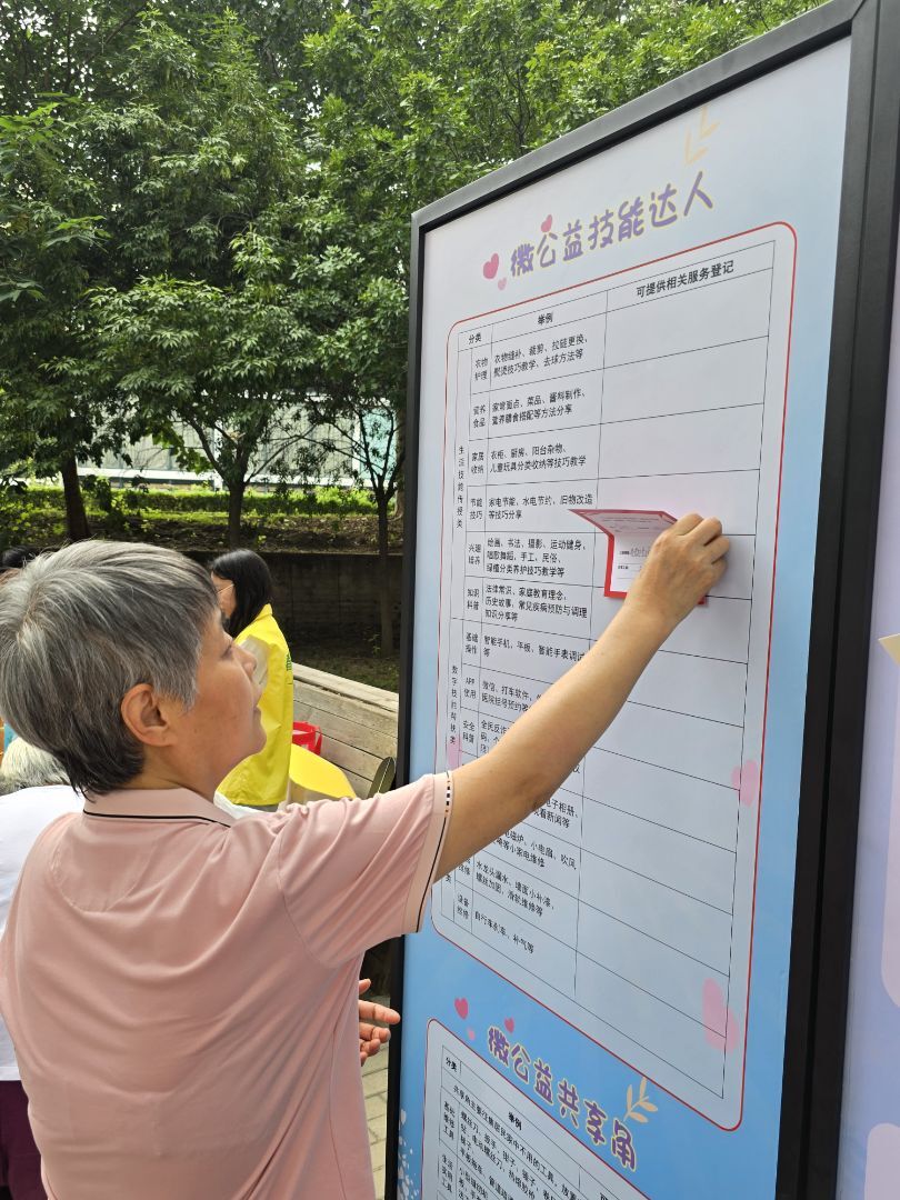 公益联动:征集服务力量,延续公益温度。公益展板前,“技能达人服务类别”“公益共享角工具需求”等内容清晰呈现。居民们认真阅读后,纷纷填写公益共享联系卡:有居民登记可以分享健康养生知识,有居民可以教授电子产品使用,有居民表示可以将家中闲置的工具拿到社区共享。