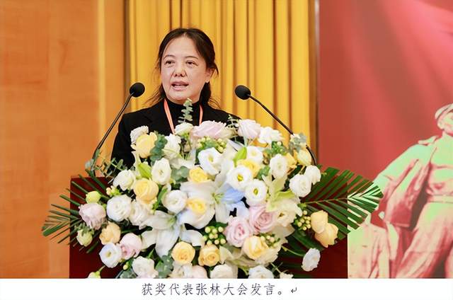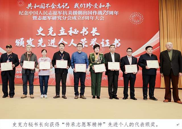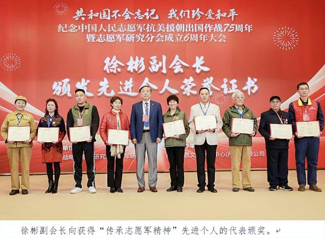 邓穗会长向获得“传承志愿军精神”先进单位的代表颁奖。黔东南苗族侗族自治州原文体广电新闻出版局党组书记、局长张林的父亲是志愿军60军老战士,她自2014年9月起开始关注抗美援朝老兵,为抢救性的做好口述历史、记录抗美援朝老兵的故事,于2016年5月申请提前退休,与丈夫龙云茂(黔东南州移民局原党组书记、局长,志愿军战士龙成福之子,)一起,专心走访抗美援朝老兵。历时十年自费义务走访了近1300个老兵,足迹遍布16个县、180个乡镇、近800个村组,抢救性的记录了黔东南志愿军老兵抗美援朝期间的故事。共拍摄照片近50000张,上万分钟视频。整理了数十万字的文字材料,收集了830份志愿军老战士手印,捐赠给中国共产党历史展览馆。她还多次组织志愿军老战士开展纪念抗美援朝活动,观看有关抗美援朝电影、为老兵拍全家福、为农村老兵过百岁生日、组织老兵到学校军营开展爱国主义教育宣讲。与“志愿军帮扶计划”组织合作,为黔东南所有健在的927位志愿军老兵每人赠送一枚特制的纪念章,给676位健在志愿军老战士赠送军用棉服,为520位健在志愿军老战士赠送志愿军军装,为409位健在的志愿军老战士赠送抗美援朝出国作战70周年大礼包。印制《他们是最可爱的人》志愿军画册一套共17册,图文并茂地传播黔东南1038名志愿军老兵的故事。画册被中国共产党历史展览馆等全国多家单位收藏,同时成为部队官兵红色教育的生动教材。