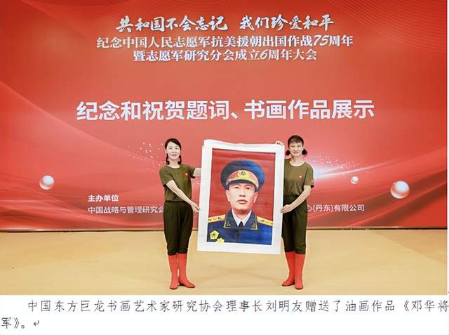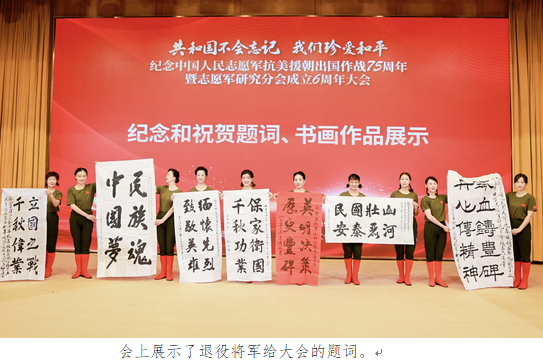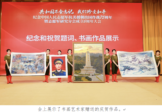 为纪念中国人民志愿军抗美援朝出国作战75周年,祝贺志愿军研究分会成立6周年,一些志愿军老部队的高级将领、退役将军和书画艺术家发来了纪念和祝贺的题词。原国防大学政委赵可铭上将发来的题词是“立国之战 千秋伟业”;原南京军区政委雷鸣球上将发来的题词是“民族魂 中国梦”;原海军副政委王登平中将发来的题词是“缅怀先烈 致敬英雄”;原总政宣传部副部长嵇绍莹少将发来的题词是“保家卫国 千秋伟业”;原军事博物馆馆长袁伟少将发来的题词是“英明决策 历史丰碑”;原国防科技大学电子科学院政委段共生少将发来的贺词是“山河壮丽 国泰民安”;原军旅著名书法家刘建武大校发来的题词是“铁血铸军魂 丹心传精神”;著名书法家赵达武发来的贺词是“雄赳赳气昂昂 跨过鸭绿江”;著名书法家苏芬兰发来的贺词是“英烈赴国难,忠魂护九州”;著名书法家邹贵生发来的贺词是“铁血征程七五载 丹心研学六春秋”;中国东方巨龙书画艺术家研究协会理事长刘明友赠送了油画作品《邓华将军》《钢铁冰雕连》《铭记浴血荣光》;朝鲜社会科学院博士、北京朝艺在线文化交流有限公司总经理金哲赠送了庆贺油画作品《中朝友谊塔》,著名书画艺术家腾墨之、郑克石、张恒明、张元洁、张卫东、程波、洪大亮、刘尚峰等也都赠送了书画作品。
