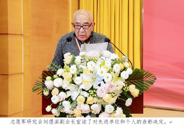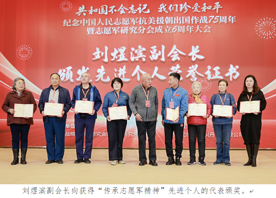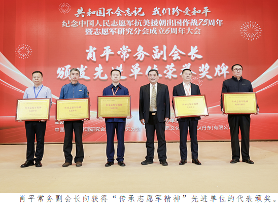 志愿军研究分会刘煜滨副会长宣读了对先进单位和个人的表彰决定。获得“传承志愿军精神”先进单位的有:志愿军精神宣讲团、志愿军精神宣传教育基地、文化教育旅游部、志愿军研究分会艺术团、志愿者服务部、医康养服务部、粤港澳大湾区办事处、志愿文化创意中心(丹东)有限公司、密山市东北老航校研究会、齐齐哈尔博物馆、四川省保健协会。志愿军研究分会战歌艺术团获得特别贡献奖。获得“传承志愿军精神”先进个人的有杨涛、李冬生、刘登赋、洪雯艳、刘磊、崔遂川、彭宇、张林、郑珠滨、刘航、郝秦、申旺、朱英、张燕敏、张京、贺小民、邓玉明、孙嘉怿、杨翌梅、孙爱娥、常纪庆、曹家麟、徐怀堂、徐树年、侯书军、谷源潭、徐涛、邹晓明、华山、陈绕天、张志勇、何凤莲、吴玉娟、朱平、赵敬伟等35人。