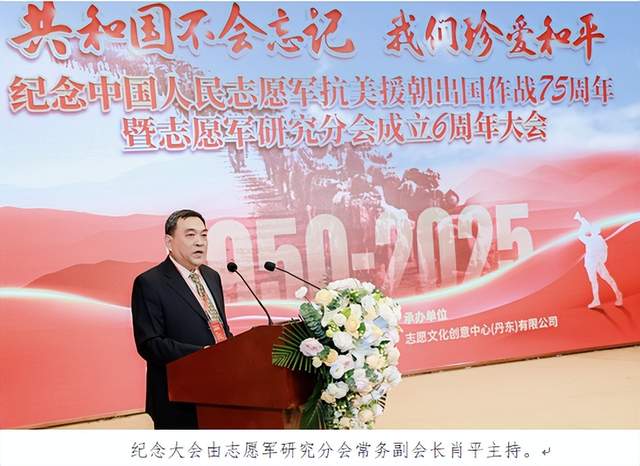 (常魁星 李天印 黄象红 郭海鹏)铭记烽火岁月, 传承英雄精神。今年是中国人民志愿军入朝作战75周年,10月25日下午,中国战略与管理研究会志愿军研究分会在北京举行了中国人民志愿军抗美援朝出国作战75周年暨志愿军研究分会成立6周年纪念活动,以“共和国不会忘记·我们珍爱和平”为主题,重温抗美援朝战争的艰辛历程和伟大胜利,缅怀浴血奋战牺牲在异国他乡的志愿军将士,弘扬伟大的志愿军精神,以激励大家为实现中华民族伟大复兴的中国梦而努力奋斗。志愿军研究分会常务副会长肖平主持纪念活动。