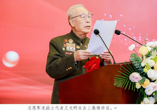 志愿军老战士王光明在会上激情讲话。王老1949年5月参加华东野战军,1952年8月入朝参战,任志愿军第24军第74师222团政治处宣传干事,亲身经历了著名的朝鲜战争的收官之战——金城战役。他说,战场上炮火连天,敌人飞机、大炮狂轰滥炸,阵地颤抖。但志愿军战士毫不畏惧,心中只有“保家卫国”四个字。大家凭着顽强意志和英勇精神,一次次击退敌人进攻,无数战友血洒疆场,用生命换来胜利。如今,抗美援朝战争已过去 75 年,但我们绝不能忘记那段历史,不能忘记牺牲的先烈。要发扬志愿军精神,勇往直前,永不退缩。