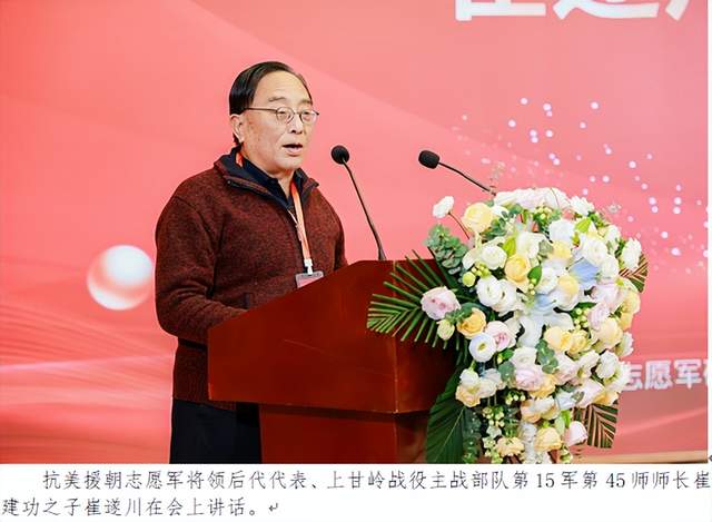 抗美援朝志愿军将领后代代表、上甘岭战役主战部队第15军第45师师长崔建功之子崔遂川在会上讲话。他说,上甘岭战役是抗美援朝战争中作战时间最长,战斗最为激烈的著名战役,我的父亲时任45师师长,在战斗中创造了以弱胜强的战争奇迹。上甘岭战役打出了军威,打出了国威。涌现出黄继光等战斗英雄和特功八连等英雄群体,有38位烈士与敌人同归于尽。志愿军精神激励着中国军民不断奋进。他的讲话,不仅表达了对志愿军前辈的敬仰之情,而且传递了弘扬传承志愿军精神的坚强决心。