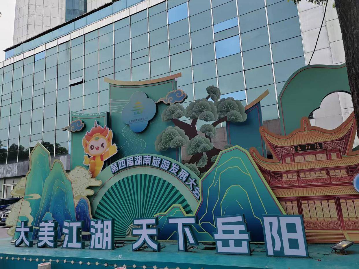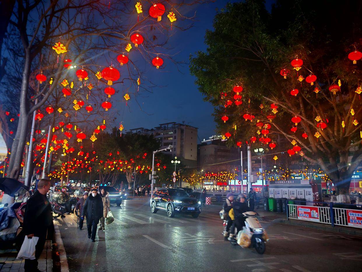 我们一大家人,几台车驶向街头。街道两旁的路灯杆挂满了一排排红色的中国结灯带。街旁高大的绿油油的樟树叶间点缀着一簇簇红灯笼。沿街店铺大多已关门,门楣上的LED广告灯屏欢快地重复移动着“给全市人民拜年”的红字。街心的绿植丛带中,耸立着“当好东道主,办好第四届湖南省文旅盛会”“大美江湖,天下岳阳”的红色大字标牌。城市广场上,一座红绸银蛇张灯结彩的大拱门正迎接着来往的行人。满眼是红,空气都红起来了。