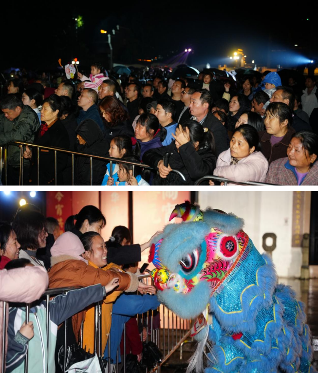 19:50,迎宾表演率先点燃热情——祥狮叩首启门,实验学校舞龙队伍紧随其后,巡演队伍从文化城大门一路行至宗祠前,所到之处欢呼不断。